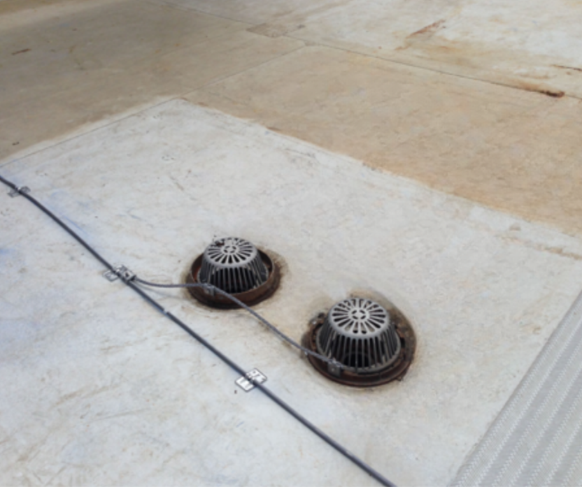 Metal roof drains are bonded to the roof conductor that passes close to them, reducing the risk of dangerous side flashes or ineffective protection.
